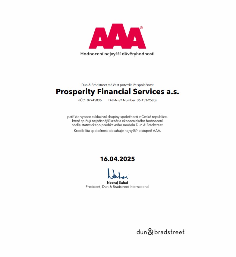 ProsperityFS získala nejvyšší možné hodnocení stability AAA od společnosti Dun & Bradstreet. Tuto certifikaci získává méně než 0,1 % firem v České republice.
